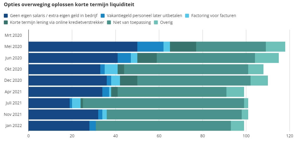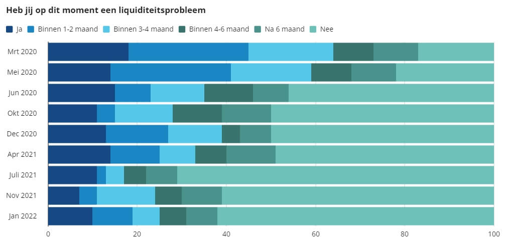 Sinds de start van de coronacrisis in maart 2020 hebben Ondernemend Nederland (ONL) en Stichting MKB Financiering elke 2 maanden onderzocht hoe het met de liquiditeit en financiering van ondernemend Nederland staat. Begin dit jaar is de negende peiling uitgevoerd, waarin ook de effecten van de huidige lockdown zijn genomen. Het percentage bedrijven met een liquiditeitsprobleem is sinds juni 2021 weer opgelopen van 29% naar 38%.